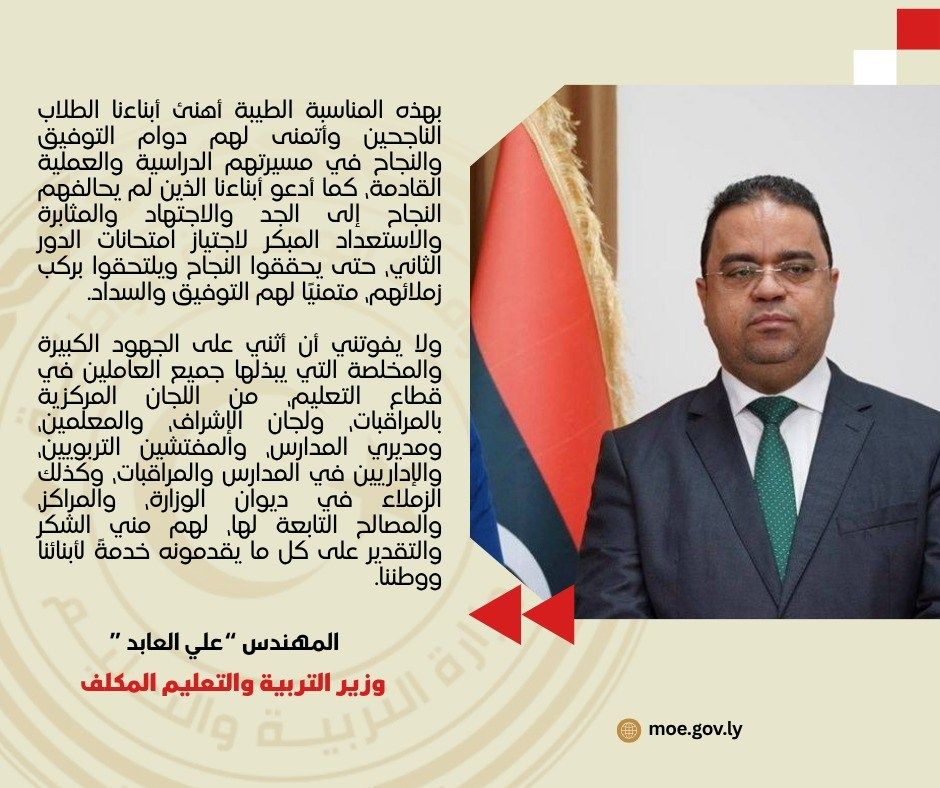 شهد وزير التربية والتعليم المكلّف المهندس “علي العابد” صباح اليوم الخميس، فعاليات الحفل الختامي للدورة التاسعة من مبادرة تحدي القراءة العربي الذي احتضنه فندق كورنثيا بالعاصمة طرابلس، وسط حضور وكلاء الوزارة، ورؤساء المصالح والمراكز، ومديري الإدارات والمكاتب، إضافة إلى المنسقين المحليين للمبادرة، والطلبة المشاركين وذويهم من كافة ربوع ليبيا .